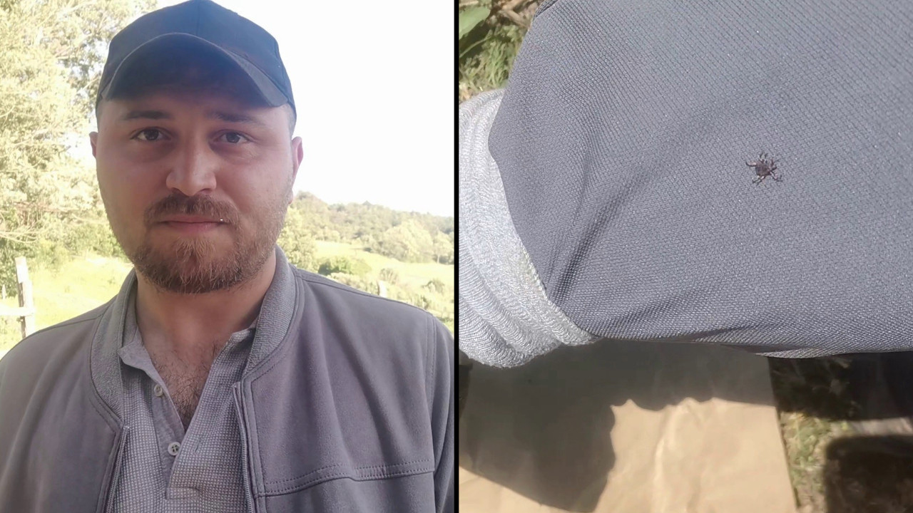 Sivas'ta tarlaya ot toplamaya giden bir vatandaş, vücuduna tırmanan keneyi görünce büyük panik yaşadı. O anları cep telefonuyla kayda alan vatandaş, "Köpekler kokumuzu alıp nasıl geliyorsa, keneler de o şekil üzerimize geliyor" dedi.
