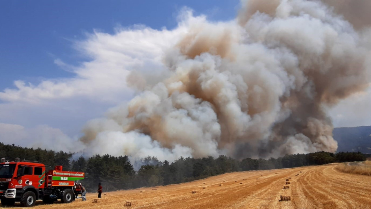 Bolu'nun Mudurnu ilçesinde anız tarlasında başlayan yangın, rüzgarın da etkisiyle kısa sürede büyüyerek ormanlık alana yayıldı.