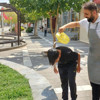 Yüksek sıcaklıkların hayatı olumsuz etkilediği ilçede, bazı çocuklar süs havuzunda, bazı çocuklar da hortum ve ibrikle başlarına su dökerek serinlemeye çalıştı.