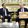Basına açık görüşme sırasında önündeki masaya inşa edilecek 250 milyon dolarlık balo balosunun bir maketini koyan Trump, eline de balo salonunun içini gösteren bir fotokopi tuttu.
