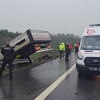 O.Ö. idaresindeki TIR'la ilerlerken yağmur nedeniyle kayganlaşan yolda direksiyon hakimiyetini kaybederek yoldan çıktı ve şarampole yuvarlandı.