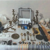 Evde yapılan aramada; 500 gram altın tozu, 335 adet değerli taş ve 13 tarihi eser niteliğinde obje bulundu.