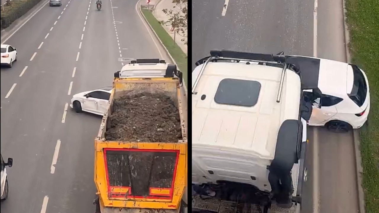 Kamyon, önüne aldığı otomobili yaklaşık 100 metre sürükledikten sonra durabildi.