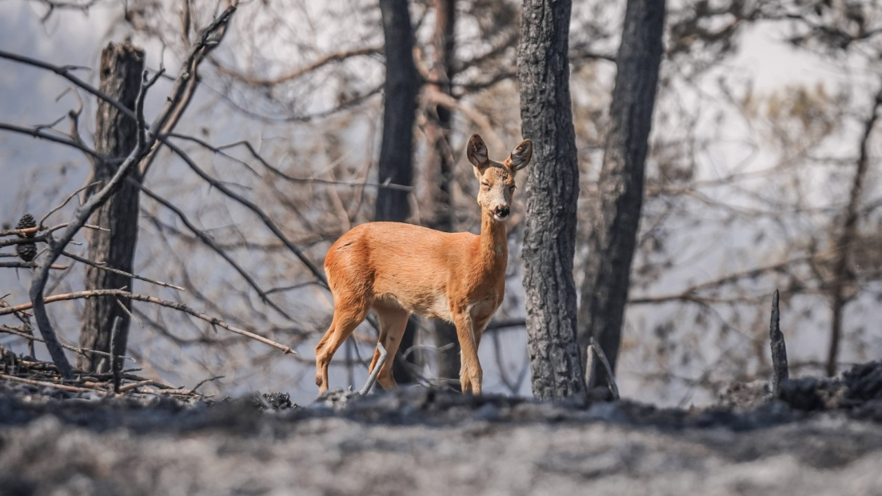 Çanakkale'nin Gelibolu ilçesinde ormanlık alanda başlayıp Eceabat ilçesine ulaşan yangında alevlerden kaçan karaca görüntülendi.