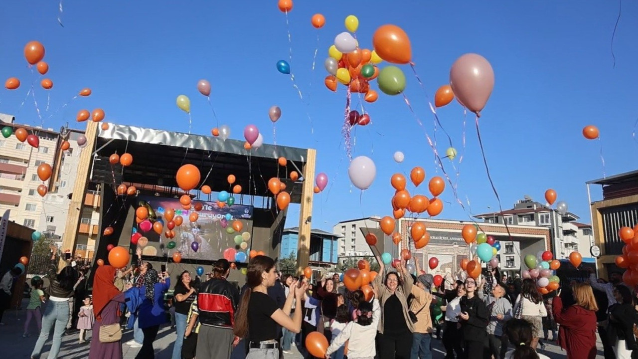 Defne ilçesi Çekmece Mahallesi'nde bulunan çarşıda bir araya gelen kalabalık, Ceylin ve annesiyle birlikte rengarenk balonlarını gökyüzüne bıraktı.