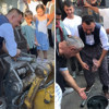 Evin önünde bulunan kepçeyi yağlamasını isteyen gençler damada gres pompası vererek iş makinasının yağlanmasını istediler. Gençlerin isteğini kırmayan damat Mert Fidan, her gün yaptığı işi bu kez en mutlu gününde gerçekleştirdi.