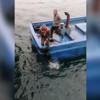 Tekneye alınan köpek kıyıya çıkarıldı. O anlar ise cep telefonu kamerasıyla kaydedildi.