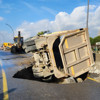 Edinilen bilgiye göre, Balıkesir'in Edremit ilçesi Ülkü Yolu üzerinde hareket eden 26 VF XXX plakalı hafriyat kamyonu, yolun çökmesi sonucu oluşan çukura düştü.