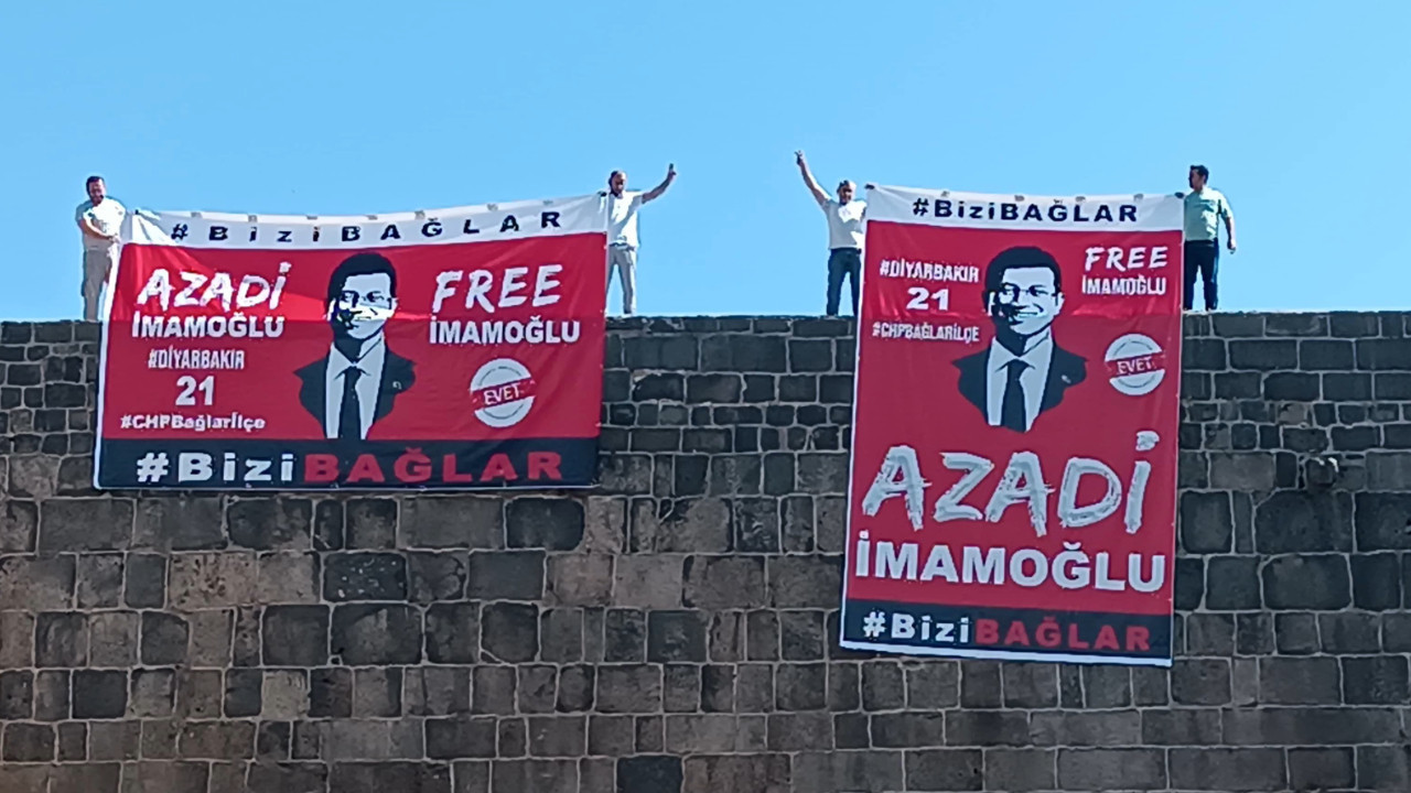 CHP Bağlar İlçe Başkanlığı tarafından CHP'nin Cumhurbaşkanı adayı Ekrem İmamoğlu için Diyarbakır surlarına Kürtçe özgürlük anlamına gelen “Azadi İmamoğlu” ile “Free İmamoğlu” pankartları asıldı.
