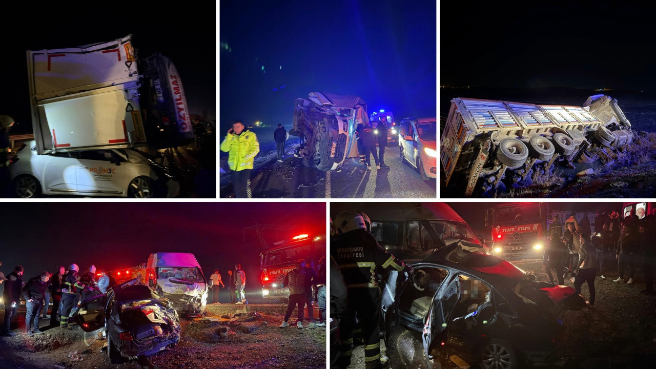 Diyarbakır Bismil karayolu kırsal Başaklı Mahallesi yakınlarında plakaları öğrenilemeyen 2 otomobil, TIR, kamyonet ve minibüs çarpıştı. Zincirleme kazanın ardından TIR, tarlaya devrilirken kamyonet bir otomobilin üzerine yan yattı.