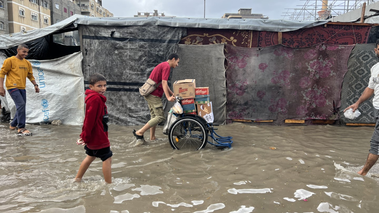 Şiddetli yağış nedeniyle Gazze Şeridi'nde çadırlar sular altında kaldı, İsrail saldırılarından canını zor kurtaran Filistinliler yaşam mücadelesini zorluklar içinde sürdürüyor.