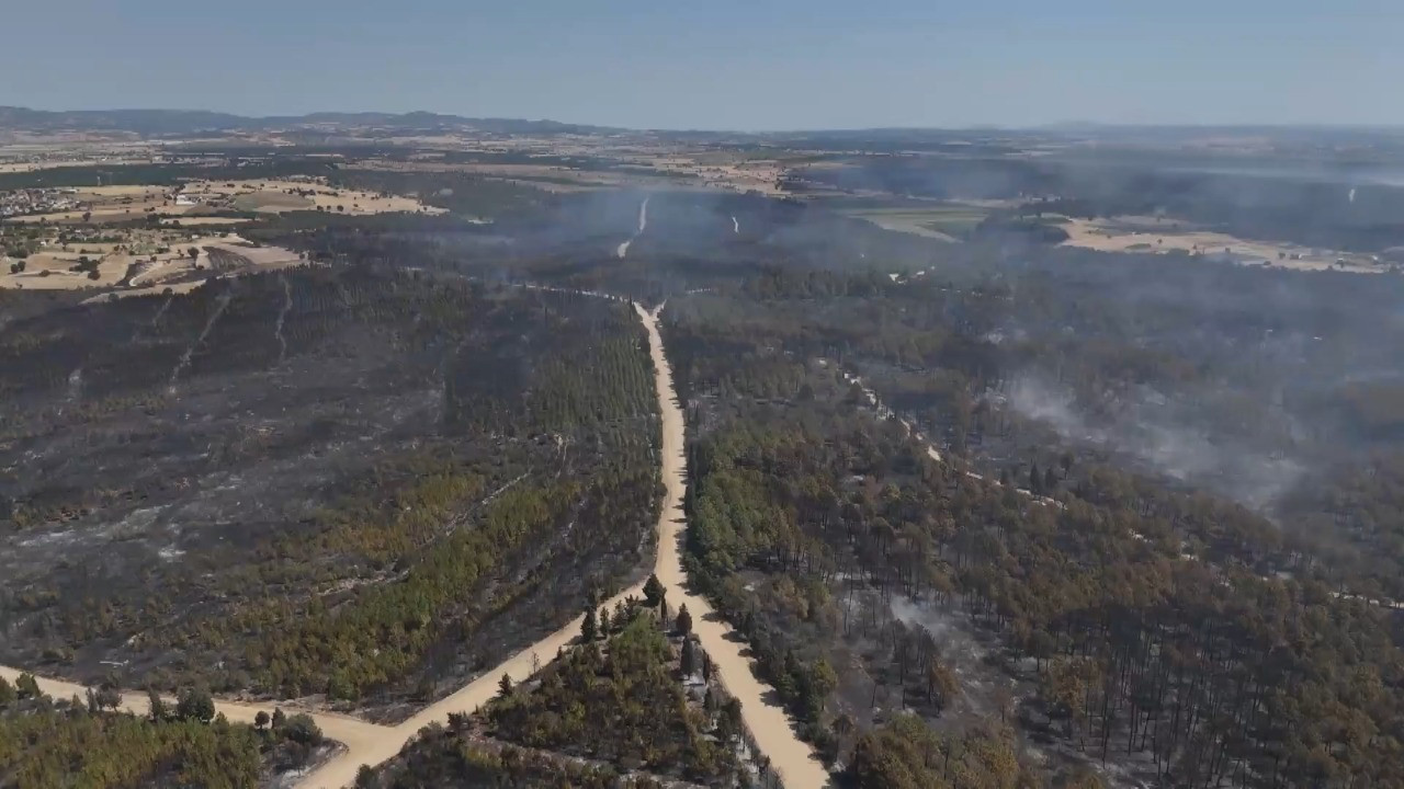 Edirne’nin Enez ilçesinde 16 saat sonra kontrol altına alınan orman yangınında etkilenen alan, havadan görüntülendi.
