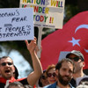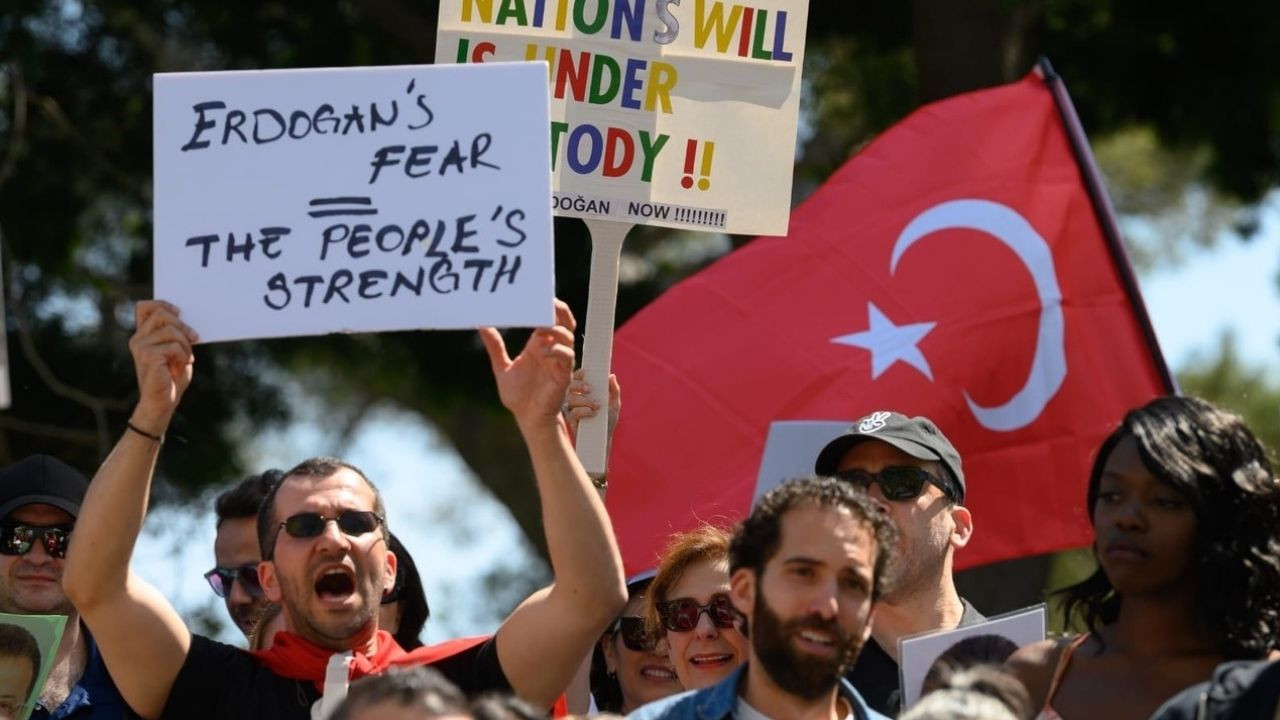 İstanbul Büyükşehir Belediye (İBB) Başkanı Ekrem İmamoğlu’nun tutuklanmasını protesto etmek için Türkiye'nin Los Angeles Başkonsolosluğu önünde bir araya gelen Türk toplumu, "Kurtuluş yok tek başına, ya hep beraber ya hiçbirimiz" yazılı pankart açtı.