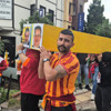 Taraftarlar, maç öncesinde omuzlarına aldıkları tabutla, tekbirler getirerek, şehirde yürüdü.