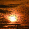 Batan güneşe doğru ilerleyen kuşlar, kısa süre içinde geniş bir alanı kapladı. Yoğunlaşarak bir bulut görünümü alan sürü, ardından ince çizgiler halinde dağıldı. Bu sırada kuşlardan yükselen sesler, gün batımının sessizliğine eşlik etti.