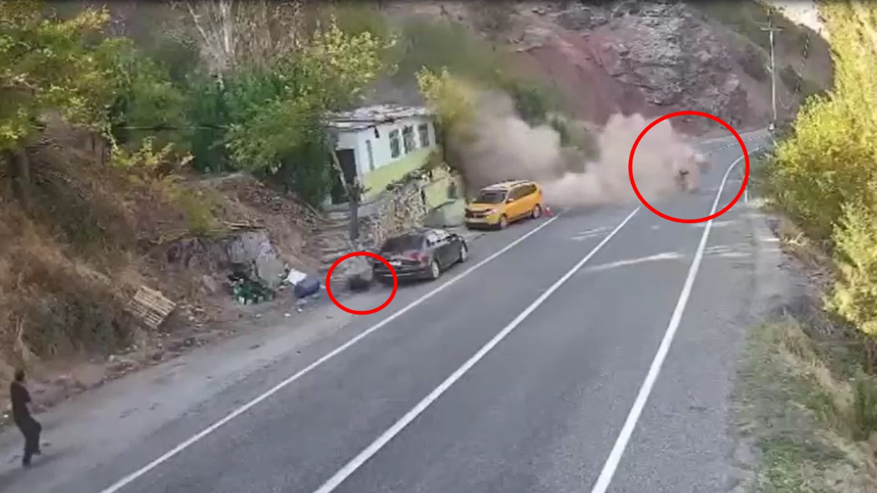 Otomobilin sürücüsü taksiye doğru gelen kaya parçalarını görerek şoförü uyardı. Durumu fark eden taksinin şoförü "Kaç oradan kaç" uyarısının ardından hızla koşarak bölgeden uzaklaştı.