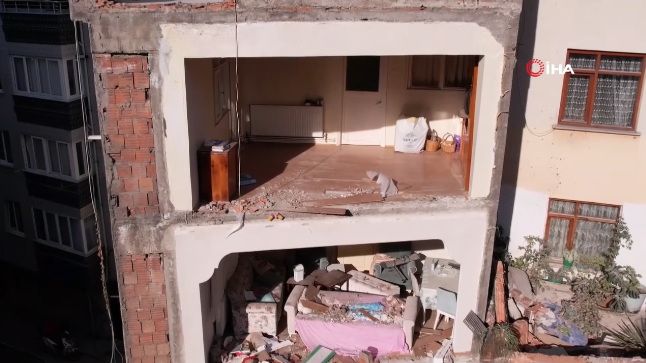 İstanbul Zeytinburnu Veliefendi Mahallesi Arif Şentürk Sokağı'nda bulunan 3 bina kentsel dönüşüm çalışmaları kapsamında yıkılmaya başlandı. Binaların yıkımı sırasında bitişikteki 3 katlı binanın duvarının olmadığı ortaya çıktı. Duvarı bulunmayan bina havadan görüntülendi.