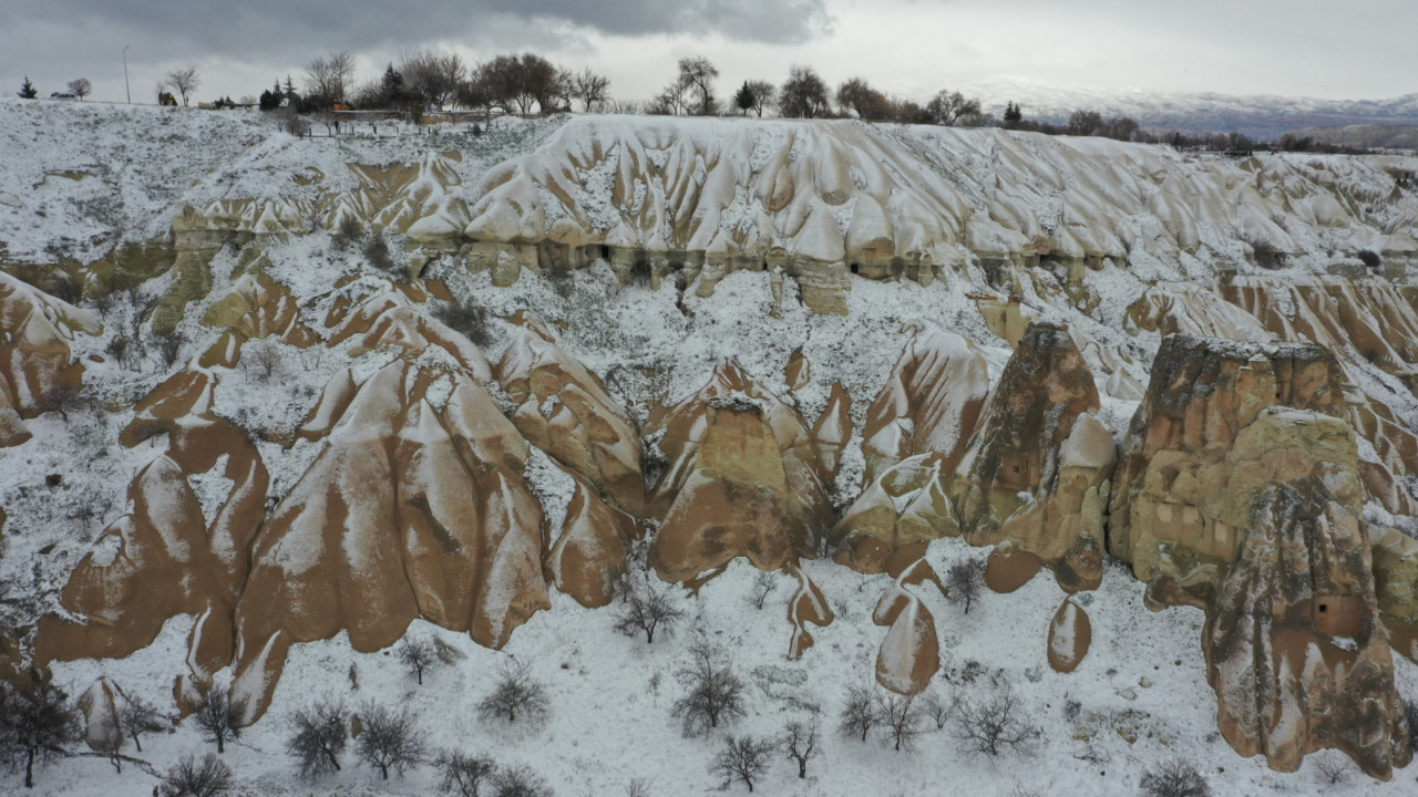 Kapadokya'daki peribacaları kar yağışıyla beyaza büründü