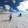 Ergan Dağı'nda sezonun ilk kayağını yapan 2 arkadaş, motosikletleriyle de beyaz örtü üzerinde tur attı.