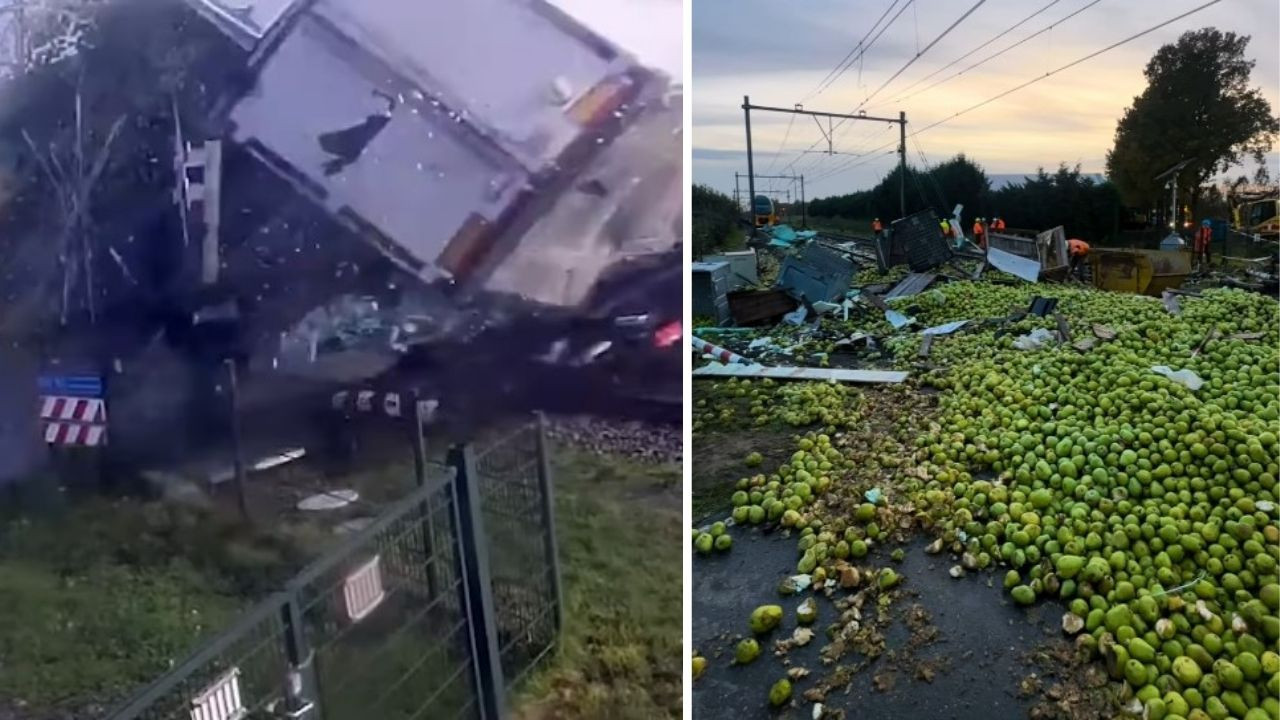 Hollanda’nın Gelderland kentindeki Meteren köyünde, hemzemin geçitten geçerken mahsur kalan armut yüklü TIR’a, yolcu treni çarptı.