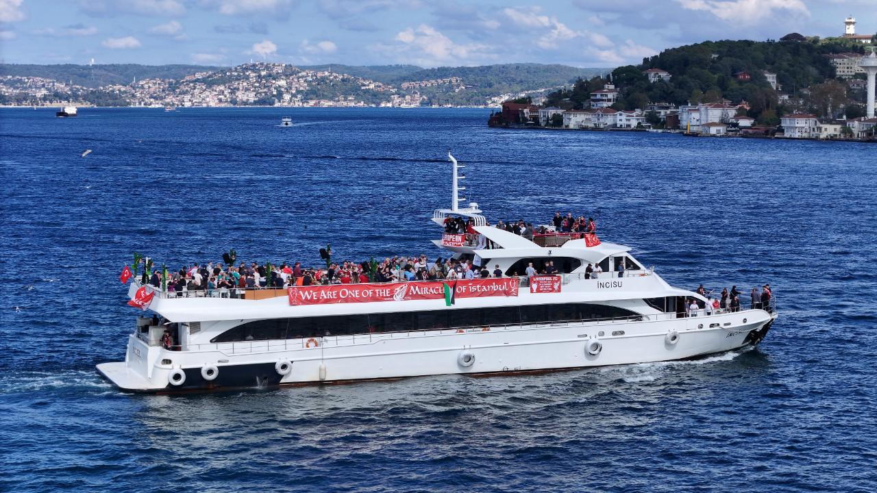 Taraftarları taşıyan tekne, Galatasaray Adası'nın önünden geçerken, adada bulunan Galatasaraylılarla Liverpoollular birbirine el salladı.