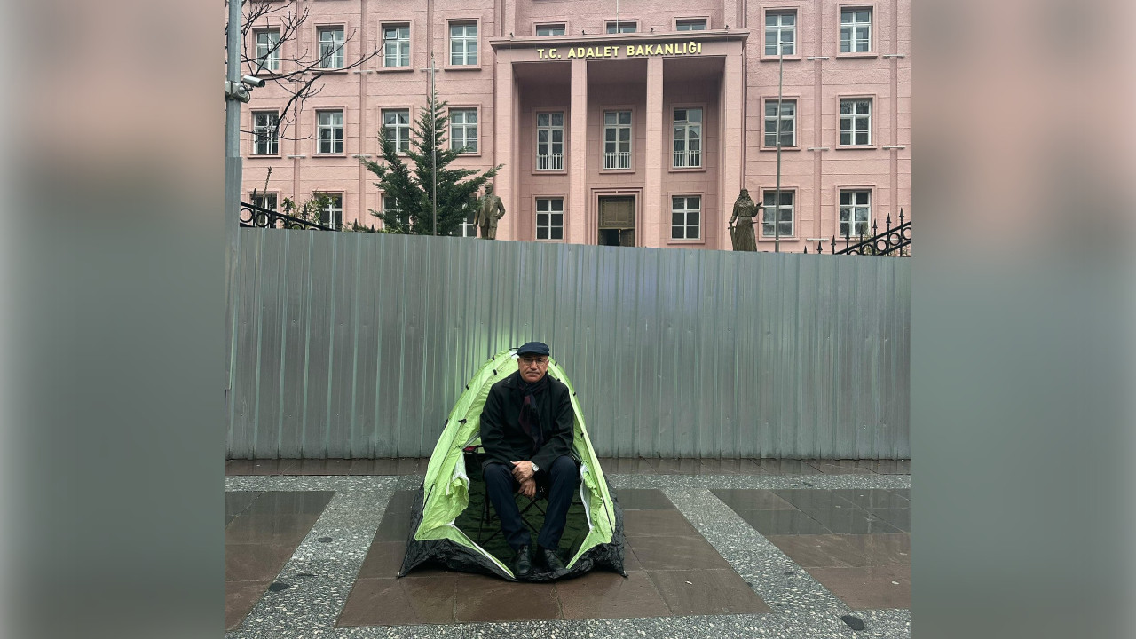 * "Şimdi yağmur yağıyordu. Ben tabii ki burada tutuklu bulunan gençler ve öğrenciler için yapılan hukuksuz yargılamalar ve cezaevine atıldığı için en azından bu hukuksuzluğu Adalet Bakanlığı'na duyurabilmek için demokratik hak olan, tek başıma burada yağmurda ıslanmamak için o çadırı ben kurdum ve çadırın üzerinde şu iskemleyi getirip bu kanun kitaplarını getirdim. Bunların ıslanmaması için ve ıslanmamak için kurduğum çadırı emniyet çekti, kırıldı. Netice itibarıyla arabama koydum. Yani şu anda çadırın olmamasının nedeni bu. Zaten gördüğünüz bu kanun kitaplarının buraya çıkarılmasından bile rahatsız oldular. Yani Türkiye hukuk devleti değil mi, kanundan niye korkuluyor? Bu kanunlar yasadışı değil, kaçak değil. Meclis’te çıkartılan kanunlar maalesef suç unsuru haline gelmiş durumda.”