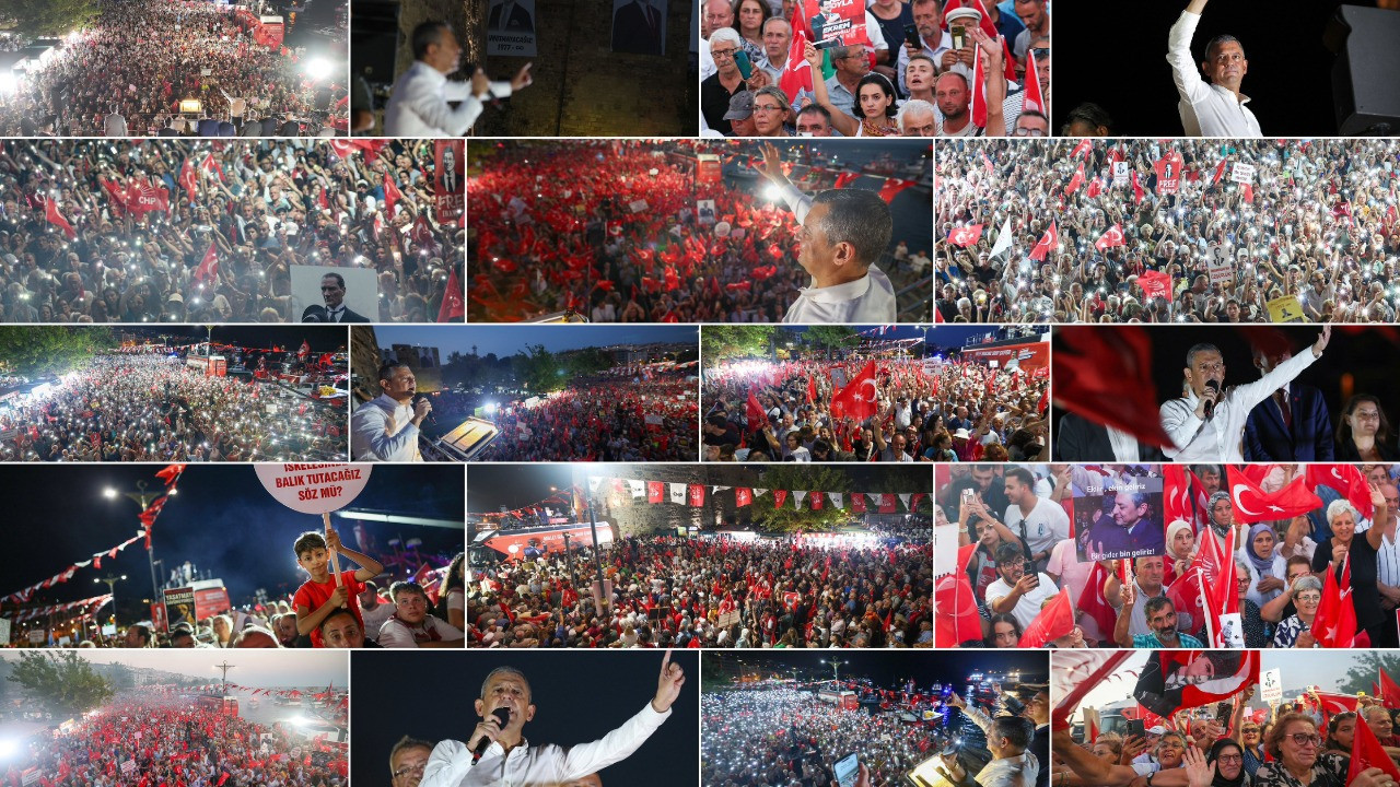 Kalabalık kitleler erken saatlerde bayrak ve dövizlerle miting alanını doldurdu. CHP lideri Özgür Özel miting alanına tekne ile geldi. Özel'in alana gelişine irili ufaklı çok sayıda tekne eşlik etti.