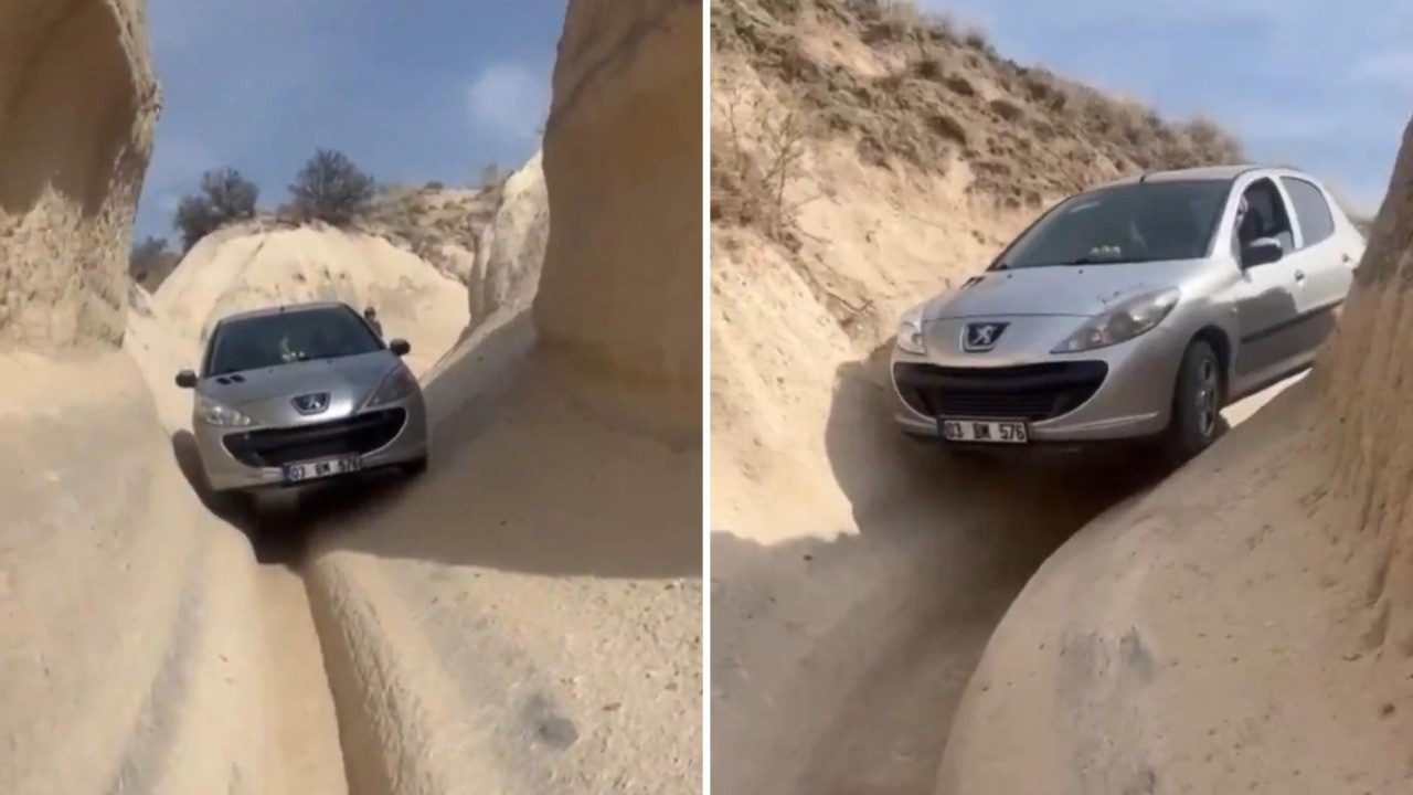 Türkiye’nin önemli turizm merkezlerinden olan Kapadokya bölgesini ziyarete gelen sürücü, navigasyonun yanlış yönlendirmesi sonrası taşıt trafiğine kapalı yola girip, peri bacalarındaki kayalıklar arasında ilerledi.