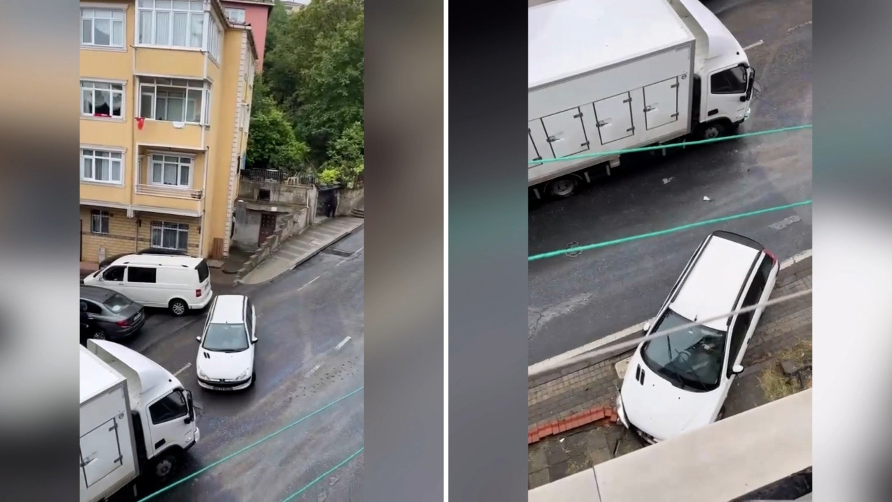 Öte yandan, bir vatandaşın cep telefonuyla kaydettiği görüntülerde, yokuş aşağı inen bir otomobilin, kayarak önce kaldırıma çıkması, sonra bir kamyonete çarpıp duvara vurduktan sonra durması yer alıyor.