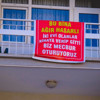 Duruma tepki gösteren Yener evinin balkonuna "Bu bina ağır hasarlı, iki evi olanlar kiraya verip gitti, biz mecbur oturuyoruz" yazılı bir pankart astı.