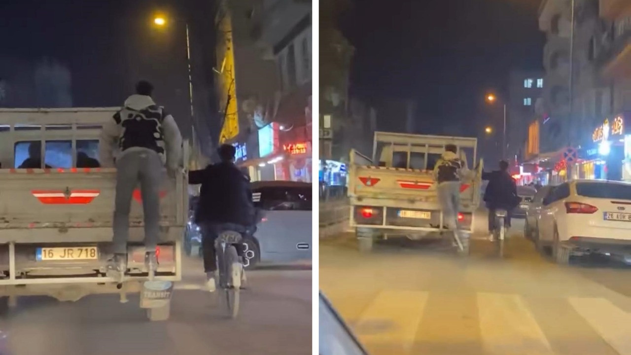 Bursa'nın İnegöl ilçesi Yenice Mahallesi Nuri Doğrul Caddesi üzerinde akşam saatlerinde patenli ve bisikletli iki genç, seyir halindeki bir kamyonetin arkasına tutunarak bir süre trafikte ilerledi.