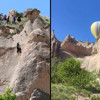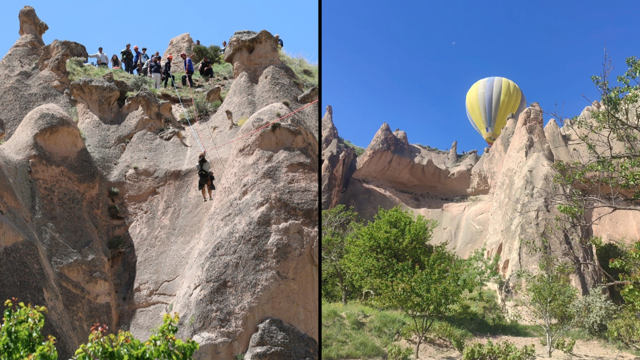 Öte yandan, AFAD ve itfaiye ekipleri, bir peribacasının yamacında mahsur kalan turistleri halat yardımıyla indirdi.