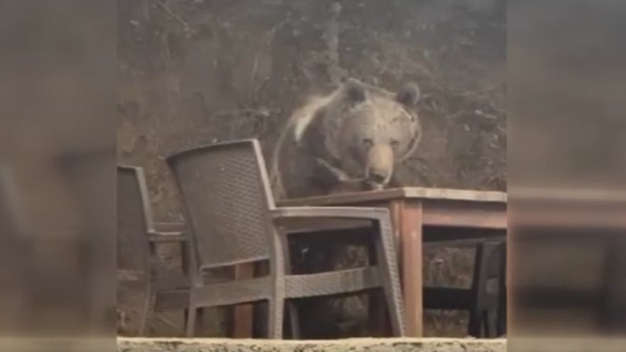Restoranda bulunan masaya oturan ayı adeta servis yapılmasını bekledi.