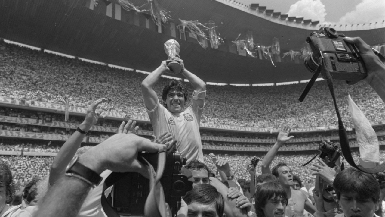 Arjantinli Diego Maradona, Arjantin’in Batı Almanya’yı yenerek Dünya Kupası'nı kazandığı maçtan sonra kupayı kaldırıyor. 29 Haziran 1986.