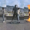 Kısa süreli alevlerin ardından şahıs, hoparlörden müzik açarak dans etti. Videonun bazı anlarında hem kameraya hem de heykele el hareketleri yaptı.