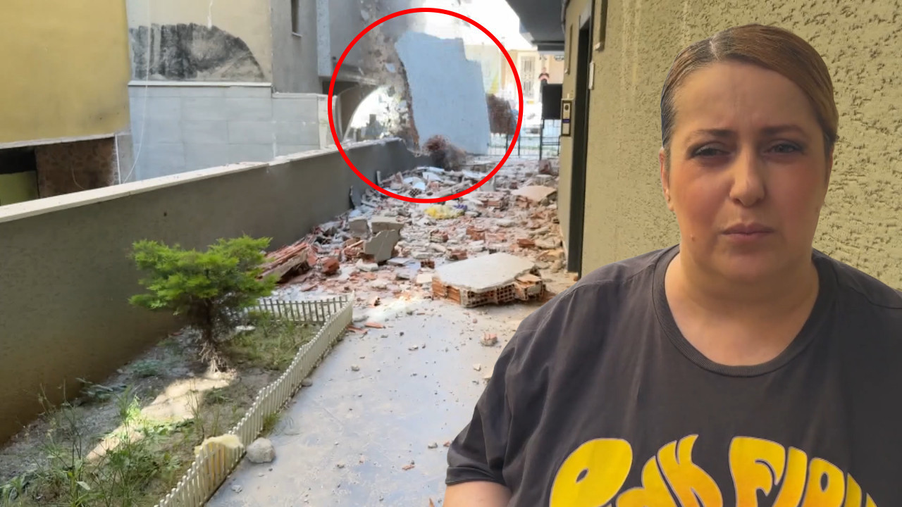 Ekiplerin incelemelerinin ardından yan binada oturan Yasemin Kartal röportaj verdiği sırada, yan binanın üçüncü katından bahçeye beton bloklar düştü.
