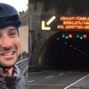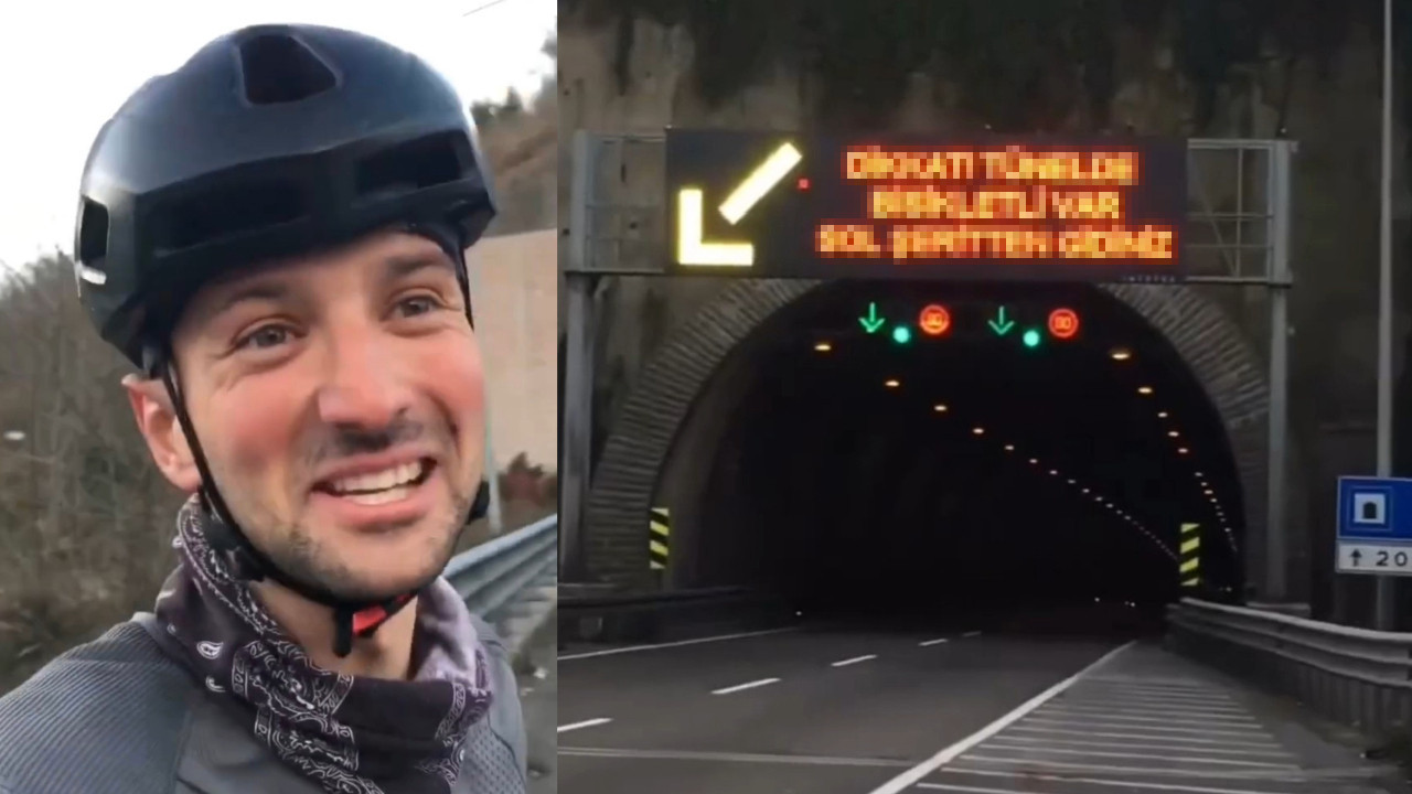 Tabelada yazan ‘Dikkat! Tünelde bisikletli var. Sol şeritten gidiniz' uyarısını görünce mutlu olan ve video çekip sosyal medyada paylaşan turist, Türkiye ve Türkleri çok sevdiğini kaydetti.