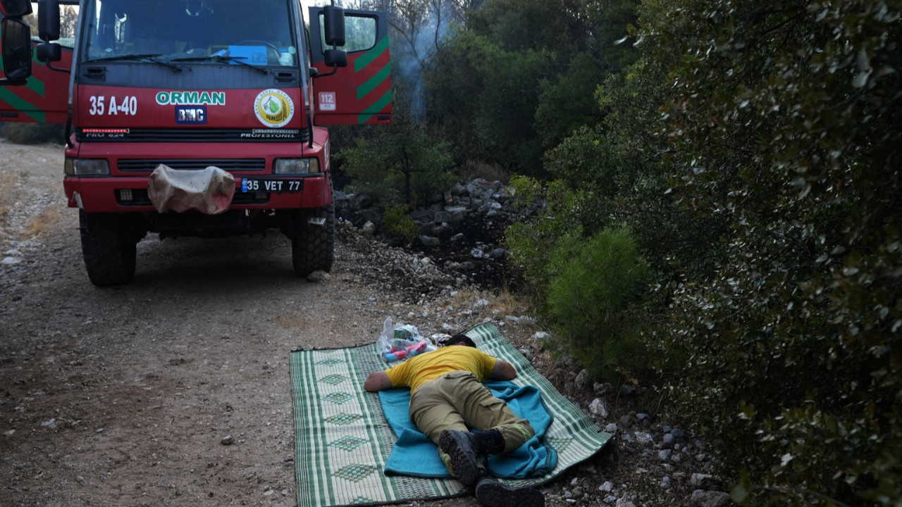 İzmir'in Buca ilçesinde dün bir minibüste çıkan yangın otoyol yanındaki ormanlık alana sıçramıştı. Yangın bugün tamamen kontrol altına alındı. Saatlerce alevlere karşı mücadele eden orman işçileri, söndürdükleri alanda dinlendi.