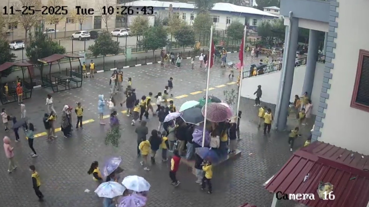 Yaklaşık 10 öğrenci, el ele vererek şemsiyeleriyle büstün üzerini çatı gibi kapattı. Ders zili çalsa da bazı çocukların büstü bırakmayıp şemsiye ile Atatürk büstünü koruduğu görüldü.