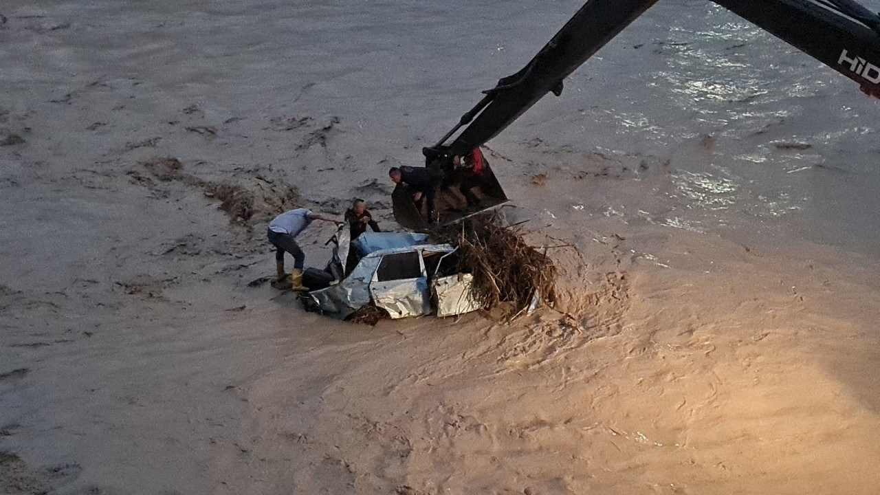 Araçların dere yatağından çıkarılması için iş makinelerinin desteğiyle çalışma başlatıldı.