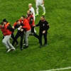 Güvenlik güçlerinin taraftarı yakalamak istediği sırada sahaya giren tribün lideri Ahmet Dirgenali şahsı darp etti.