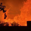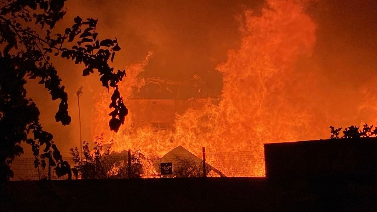 İtfaiye ekipleri yangına müdahale ederken, alevler onlarca metre yüksekliğe ulaştı, gökyüzü kara bulutla kaplandı.