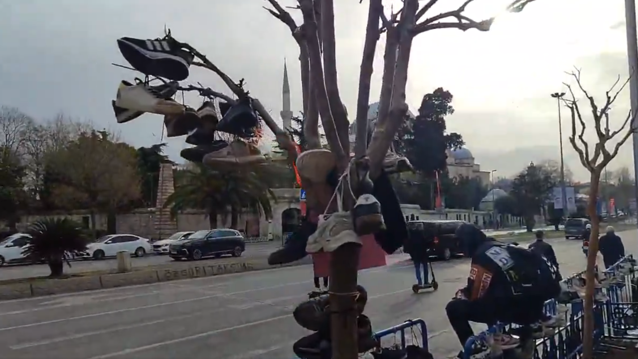 Ayakkabılar, İstanbul Büyükşehir Belediyesi binasının önündeki polis barikatlarına ve ağaca asıldı.