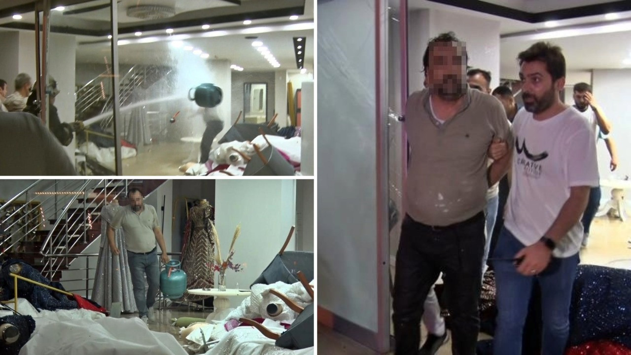 Ekiplerin tüm çabalarına rağmen gelinlikleri parçalamaya devam edip içerideki eşyalara da zarar veren Bahadır T. bir süre sonra ise üst kattan aldığı mutfak tüpünü getirdi.