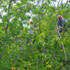 Yaklaşık 20-30 metre yüksekliğindeki ağaçlara tırmanan işçiler, sırıklarla kestane kozalaklarını düşürüyor.