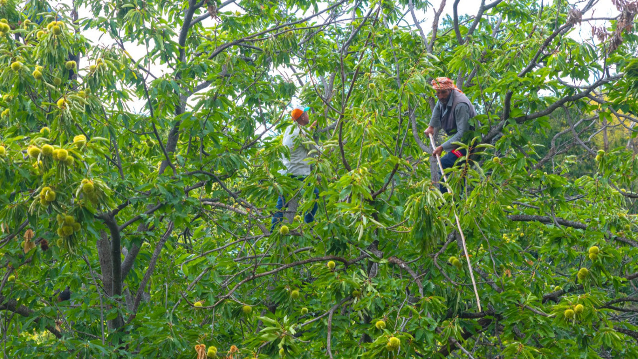 İzmir Ödemiş'te kestane hasadı başladı. 30 metrelik ağaçlara tırmanan üreticiler, sırık yardımıyla kozalakları topluyor.