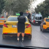Genç, orta şeritte ilerleyen taksinin arkasına tutunarak yolculuğunu sürdürürken, tehlikeli yolculuk cep telefonu kamerasına yansıdı.
