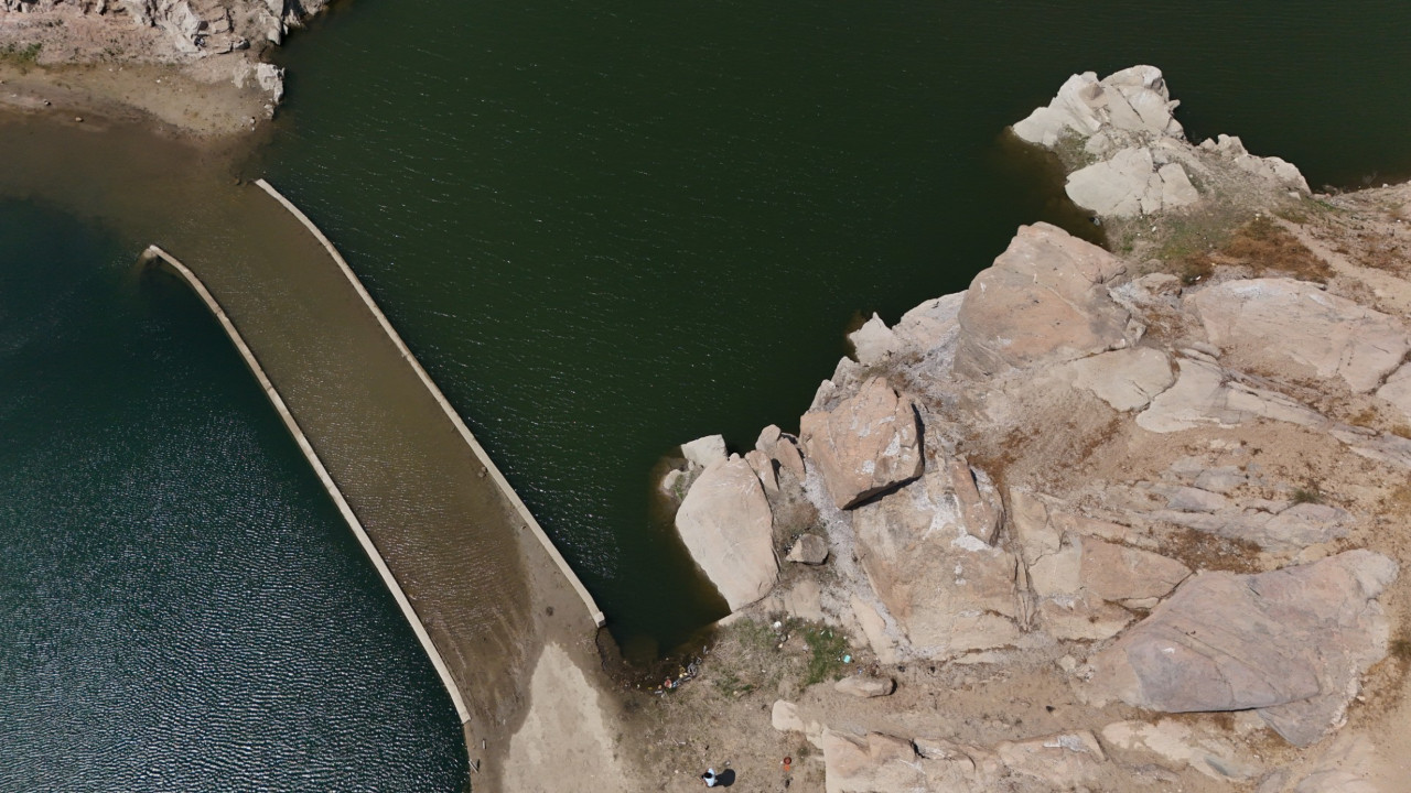 Kırklareli'nde aşırı sıcaklar ve kuraklık nedeniyle doluluk oranı azalan barajda, su altındaki Çağlayan Köprüsü gün yüzüne çıkmaya başladı.