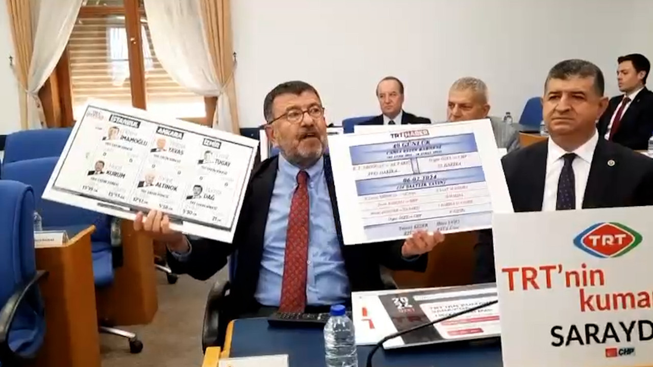 Teklif görüşmeleri öncesinde, CHP milletvekilleri TRT’yi protesto etti. Milletvekilleri, “Turp Radyo Televizyonu”, “TRT’nin kumandası sarayda” yazılı dövizlerle geldi.