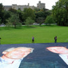 Grup, Trump'ın ziyaret edeceği Windsor Kalesi önündeki çimen alana dev bir pankart getirdi.